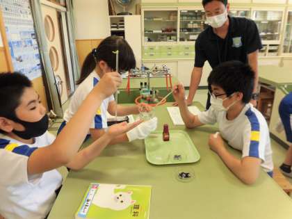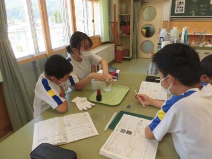 6月10日(木) 6年理科「動物のからだのはたらき」 公開日 2021/06/10 更新日 2021/06/10 6年生の部屋 だ液によるでんぷんの変化について、実験しています。 口内と同じ条件にするために、36度にしたぬるま湯の中でご飯粒をもみほぐします。 だ液を加えたものと加えないものにヨウ素液を垂らして変化を確認します。