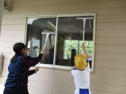 子供たちは、トイレや窓、ホームに向かう階段や池周辺まで、自分でできることを見つけながら進んで掃除していました。
