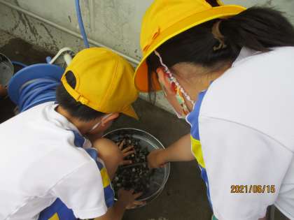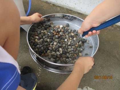 材料(小石、炭、砂利、落ち葉)をきれいに洗い、牛乳パックに詰めます。