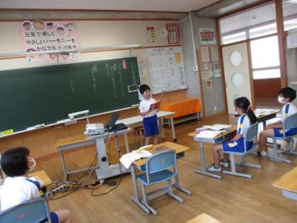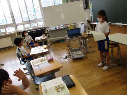 国語科「メモを取るとき」の学習で、4人の2年生は、学校や家にあるものや人について、みんなに知らせようとメモを取りました。そのメモを見ながら、文の最後に「です」や「ます」をつけるなどして、上手に話すことができました。