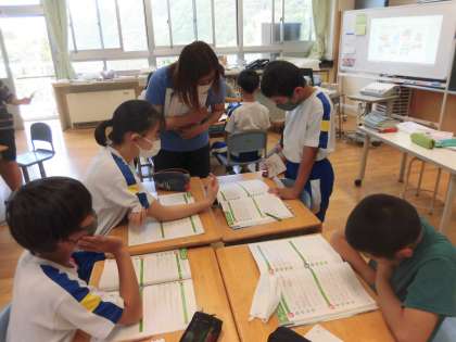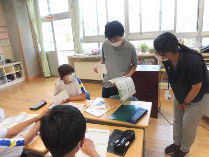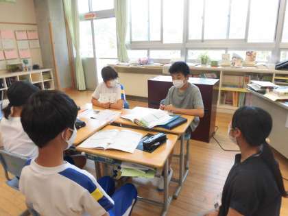 6年生は、中学校の英語の先生とALTのシェリー先生と外国語の学習をしていました。