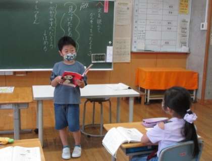 2年生は国語科の学習で、みんなに知らせたくなる「見つけたもの」について、「はじめ」「中」「終わり」の組み立てに注意しながらお知らせの文章を書きました。今日はその発表の日。友達が選んだ「見つけたもの」に興味をもつだけでなく、友達の文章の分かりやすい部分をほめるすてきな時間になりました。