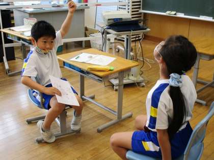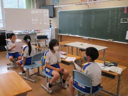 「あったらいいな、こんなもの」というテーマで、友達に話したり、質問したりする学習をしています。自分の考えたものを嬉しそうに話す姿や、友達が考えたものに興味をもって積極的にいろいろな質問をする姿が素敵でした。