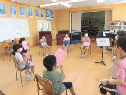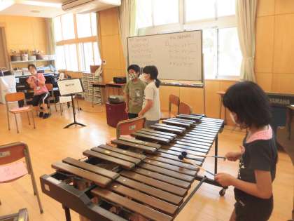 「ゆかいな木きん」の演奏をしています。1フレーズごとに木琴とオルガン、打楽器、リコーダー、歌の担当を変えて練習しています。どの楽器、歌も上手にできてきましたね。