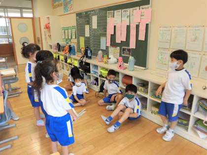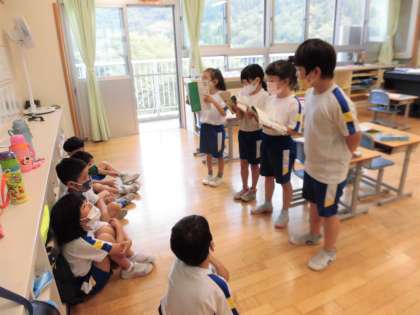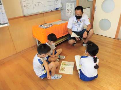 グループに分かれて、国語「おむすびころりん」の音読の練習をしています。