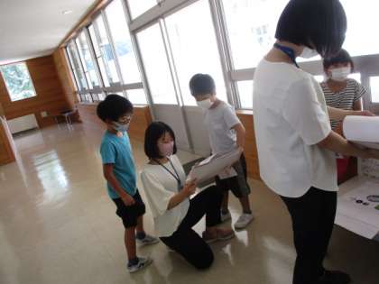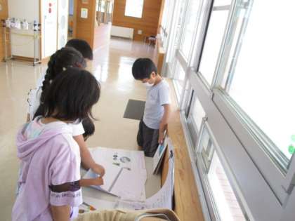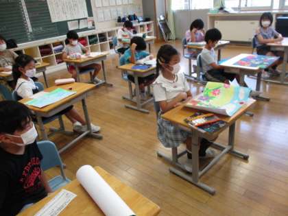 始業式から教室に戻ってきた2・3年生。夏休みに取り組んだ自由研究や作品応募などの作品を見ながら仲よく語る子供たちの姿に、2学期の明るい始まりを感じました。