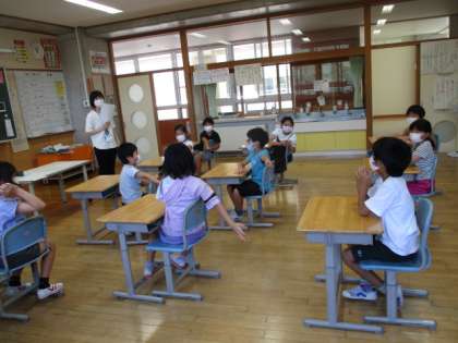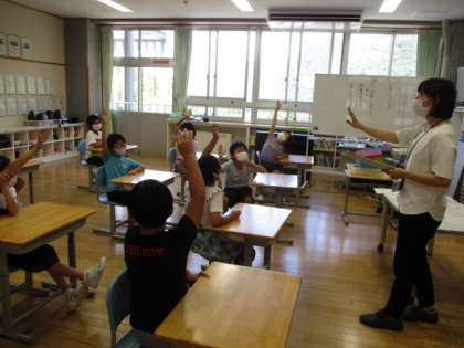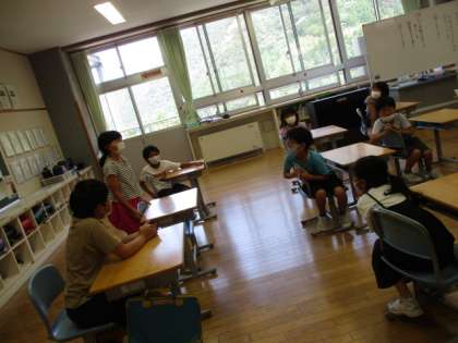 子供たちが紙に書いた「夏休み」の思い出を、先生が名前を言わずにクイズ形式で読み上げました。2・3年生は、「誰の思い出だろう?」と楽しく考え、仲よく盛り上がりました。