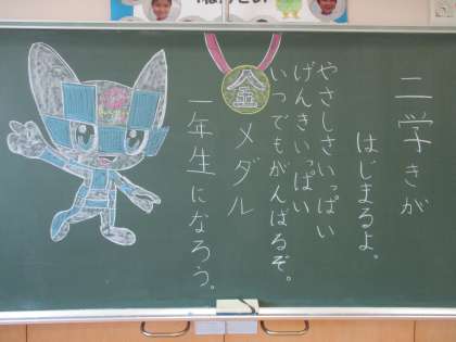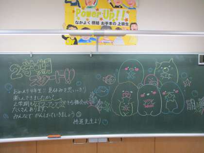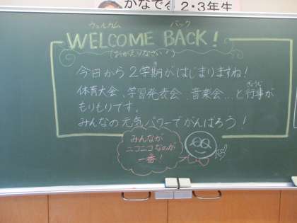 8月27日(金) 新学期の朝子供たちを出迎える黒板1年 2・3年 4年