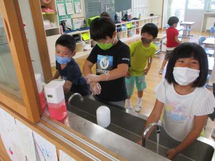 1学期に学んだ手洗いの歌に合わせて手を洗うと、洗い残しなく、30秒間手が洗えました。