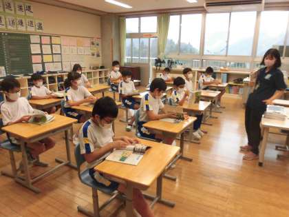 ぴかぴかの教科書を目の前に、「どんな勉強をするのかな」と、子供たちは目を輝かせて中を見入っていました。