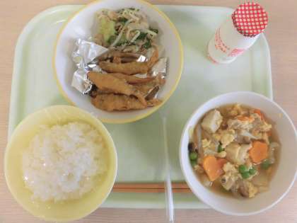 今日の給食には、高野豆腐の卵とじが出ています。、