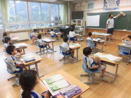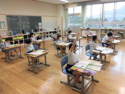 1年生は国語で、物語の読み取りをしていました。三匹のあおむしが出てくるお話です。あおむしの気持ちを考えています。「むしゃむしゃ」や「もりもり」などの表現の違いに注目して話し合っていました。