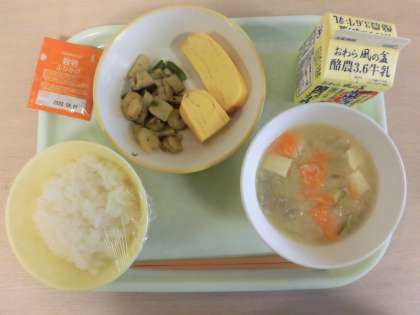 今日のメニューは、ごはん、厚焼き卵、えびときのこのガーリックソテー、呉汁、穀物ふりかけ、牛乳です。