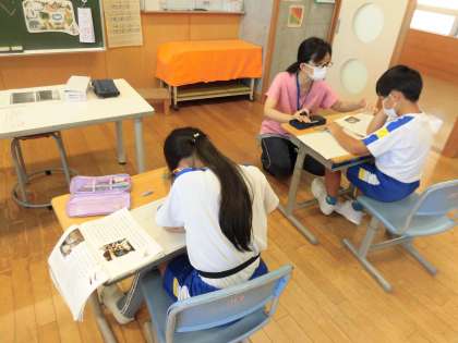 教科書の説明文を読んで、獣医さんの仕事を「いつ」「どうぶつ」「しごと」の項目に分けてまとめています。真剣に読んでいます。
