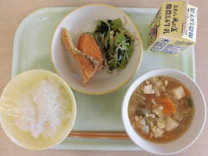 今日のメニューは、ごはん、鮭のから揚げ、小松菜ともやしの香味和え、豆腐の野菜あんかけ、牛乳です。