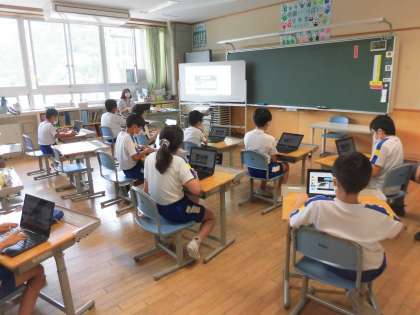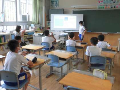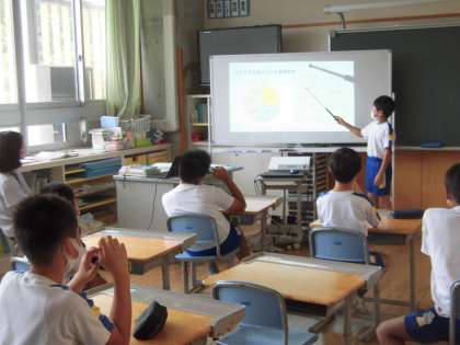 5年生の社会科では、水産業の学習のまとめとして、一人一人が、水産業について興味のあることを調べ、「スライド」にまとめて発表をしました。