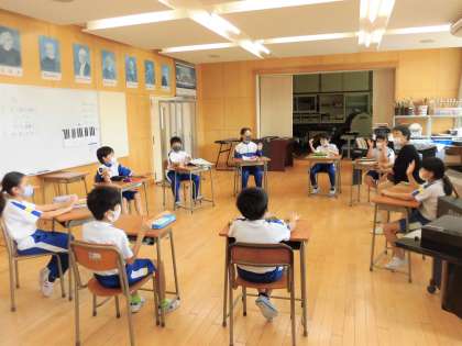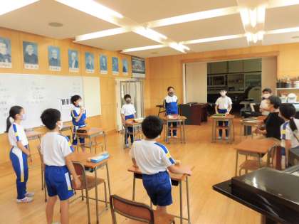 4年生の音楽では、手遊び歌「ぐーちょきぱーでなにつくろう」を3グループに分けて輪唱していました。また、作る手遊びの形も子供たちでアイディアを出し合って楽しんでいました。