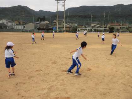 1・2年生の体育では、グラウンドでおにごっこ遊びをしました。