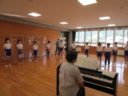 いつもは全校児童が集まっていますが、今日は低音部と高音部に分かれて授業をしました。学習発表会等で歌う「MUSIC」と「愛をあげよう」の練習です。