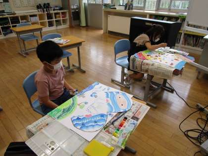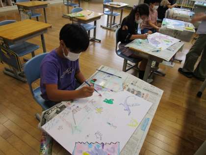 2年生は、「ふしぎなたまご」から素敵な楽しい世界が広がる様子を楽しそうに描いていました。