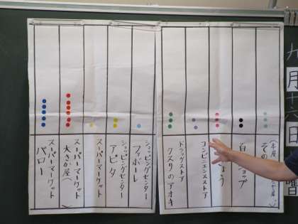 子供たちのおうちの人がよく利用するお店をグラフにして気付いたことを話し合っていました。