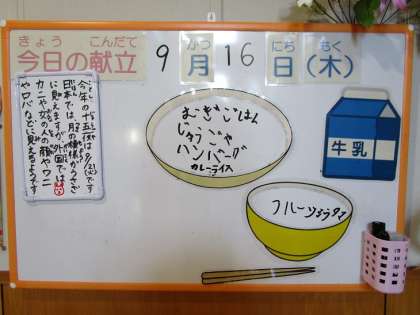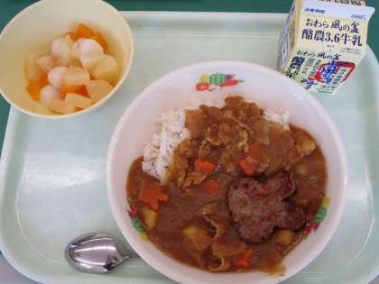 今日の献立は、麦ご飯、カレー、十五夜ハンバーグ、フルーツ白玉、牛乳です。