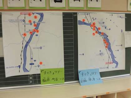 3年生の6人は、2グループに分かれて、神通碧のすてき巡るツアーを企画していました。ツアー(見学)に行った時に、どのように説明するか原稿も考えています。