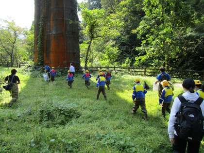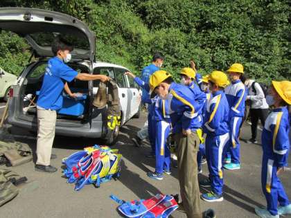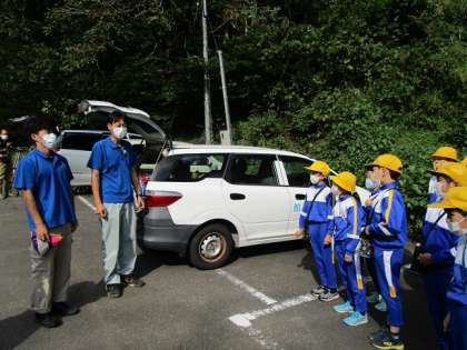 常虹の滝に到着しました。魚津水族館の方から魚を捕まえるための注意を聞き、水に濡れないように着替えもしました。