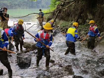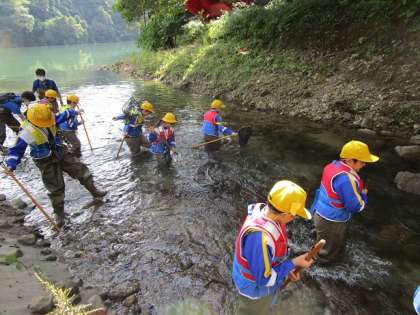 網を上手に使い、石の下にいる生き物をおびき出します。