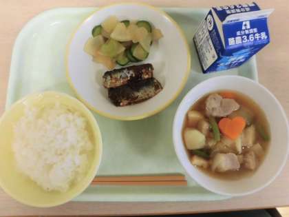 今日の献立は、ごはん、豚肉とじゃがいものうま煮、いわしの土佐煮、華風和え、牛乳です。