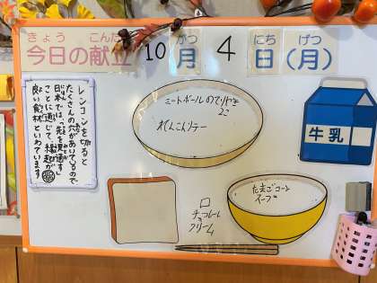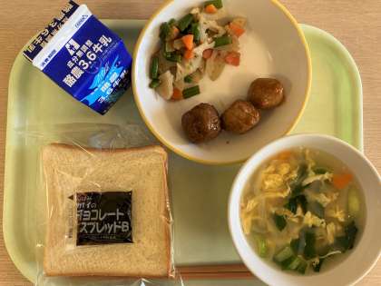 今日の献立は、食パン、ミートボールの照り焼き、れんこんソテー、卵コーンスープ、チョコレートクリーム、牛乳です。