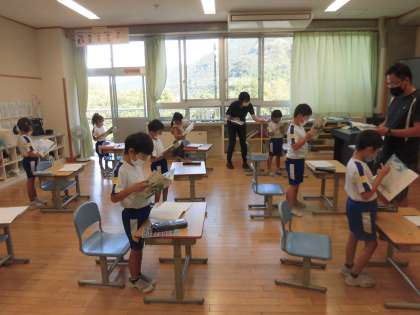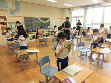 今日は、下の最初に出てくる物語文「くじらぐも」をみんなで音読していました。