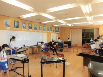 4年生は、先週リコーダーの練習をしていた「茶色のこびん」に、鉄琴や打楽器、オルガンを加えて合奏する練習をしていました。
