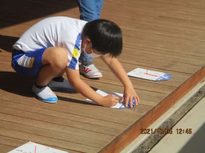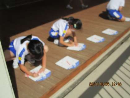 秋晴れのテラスで、3年生は1時間ごとに太陽の動きをスケッチしました。「こんなに動くんだ」と記録を見ながら思わずつぶやいていました。