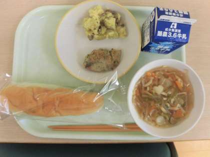 今日の献立は、米粉コッペ、たらの香味焼き、チーズおさつ、春雨スープ、牛乳です。