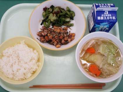 今日の献立は、ごはん、小魚入りフライビーンズ、海藻サラダ、ポトフ、牛乳です。