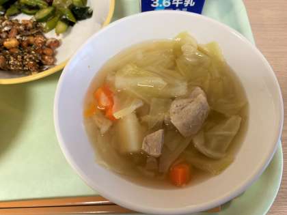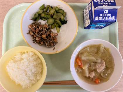 今日の献立は、ごはん、小魚入りフライビーンズ、海藻サラダ、ポトフ、牛乳です。