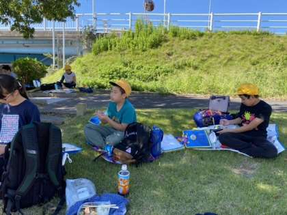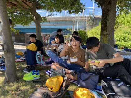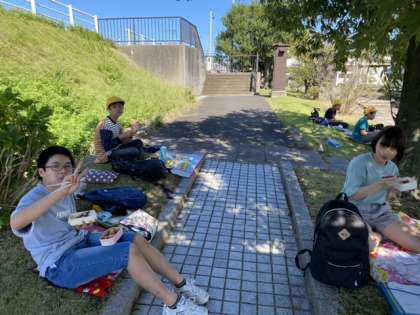 お昼ご飯タイムです。カナル会館の外の芝生広場で食べています!