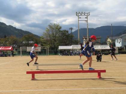 ゴールまで、ゴムひもやじゃんけん、平均台などを乗り越えていきます。今年のじゃんけん係は、校長先生とPTA会長さんです。さあ、がんばりましょう!