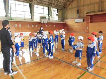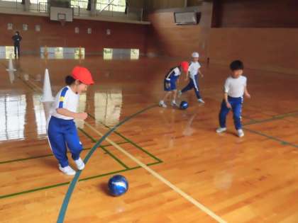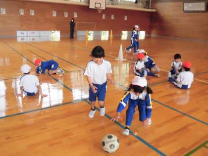 今日は、2人1組になって、ボールを蹴って運び、4カ所あるゴールに入れる運動をしていました。レベル1からレベル2へとだんだん難しくなるようです。