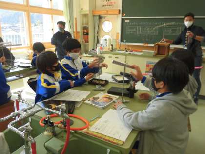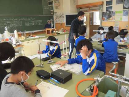 6年生は、実験用てこを使って、支点からの距離とおもりの重さとの関係について調べています。