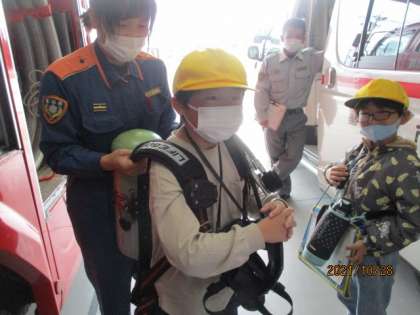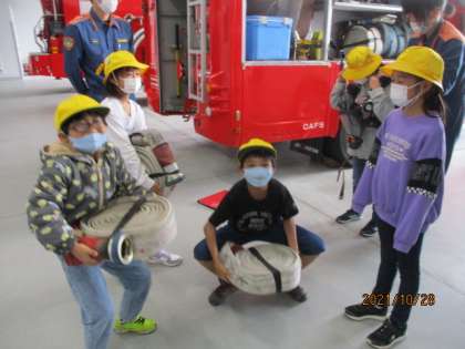 路線バスに乗って大沢野消防署へ行き、消防士の方々が私たちの暮らしをどのように守ってくださっているかを学習してきました。防火用の重たい服装に酸素ボンベ、マスクをつけ、素早く消火するために1本8kgもあるホースを数本抱えて現場にダッシュしておられることを知り、びっくりした3年生です。