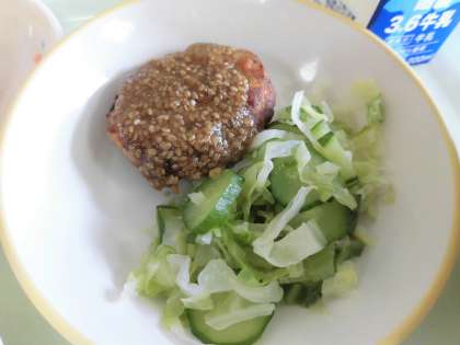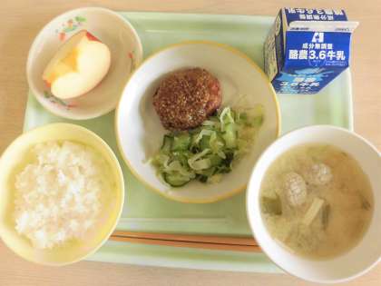 今日の献立は、ごはん、白ねぎハンバーグ、きざみあえ、ぶりつみれ汁、りんご、牛乳です。