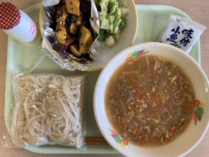 今日の献立は、ソフト麺、肉みそ、大学いも、花野菜サラダ、味付け小魚、飲むヨーグルトです。