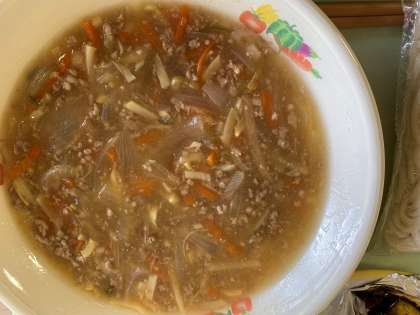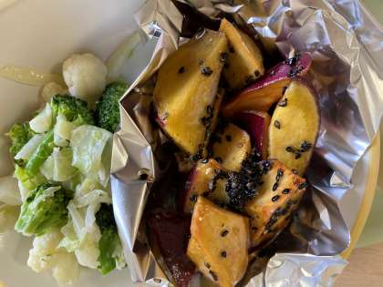 今日のソフト麺は、肉みそソースでした。このソースもおいしいです。大学いもも甘いたれとごまがたくさんかかっていておいしいです。今日もおいしくいただきました。