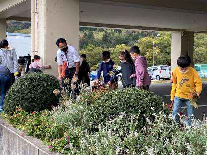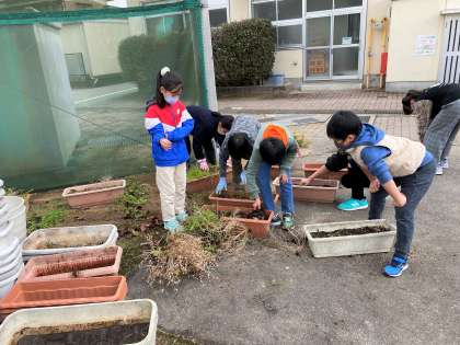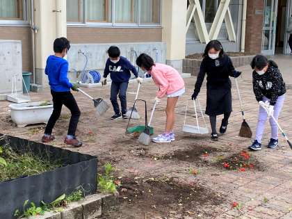 昼休みに、全校で花壇の作業を行いました。この後、サルビアやビオラ、チューリップの球根を植えるために、今植えてあるサルビアやマリーゴールドを抜いて花壇をきれいにしました。