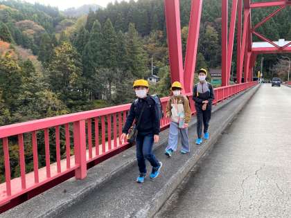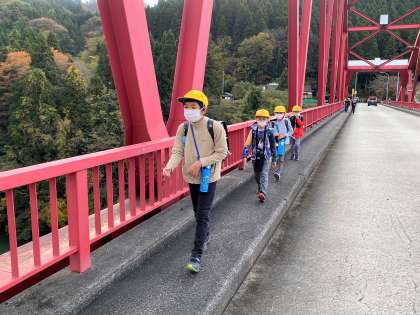 写真は観光橋を渡って登校してくる子供たちの様子です。