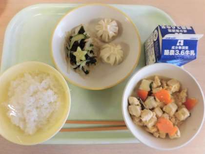 今日の献立は、ごはん、炒り豆腐、えびパオツ、きゅうりとわかめの酢の物、牛乳です。