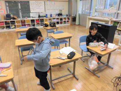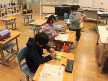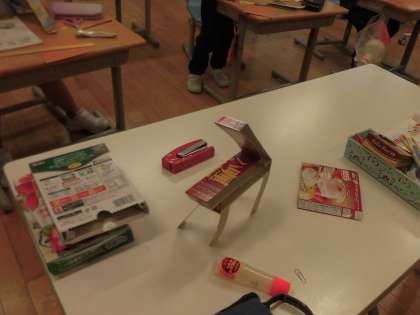 2年生は、国語の教科書に載っている説明文「おもちゃの作り方」を自分で読んで、それに従って、厚紙でおもちゃをつくっています。さて、しっかり読めば、教科書どおりのおもちゃができあがるのでしょうか。