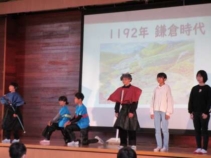 6年生は、劇「過去−現在−未来 〜昔の時代へタイムスリップ、そして未来へ〜」の発表をしました。